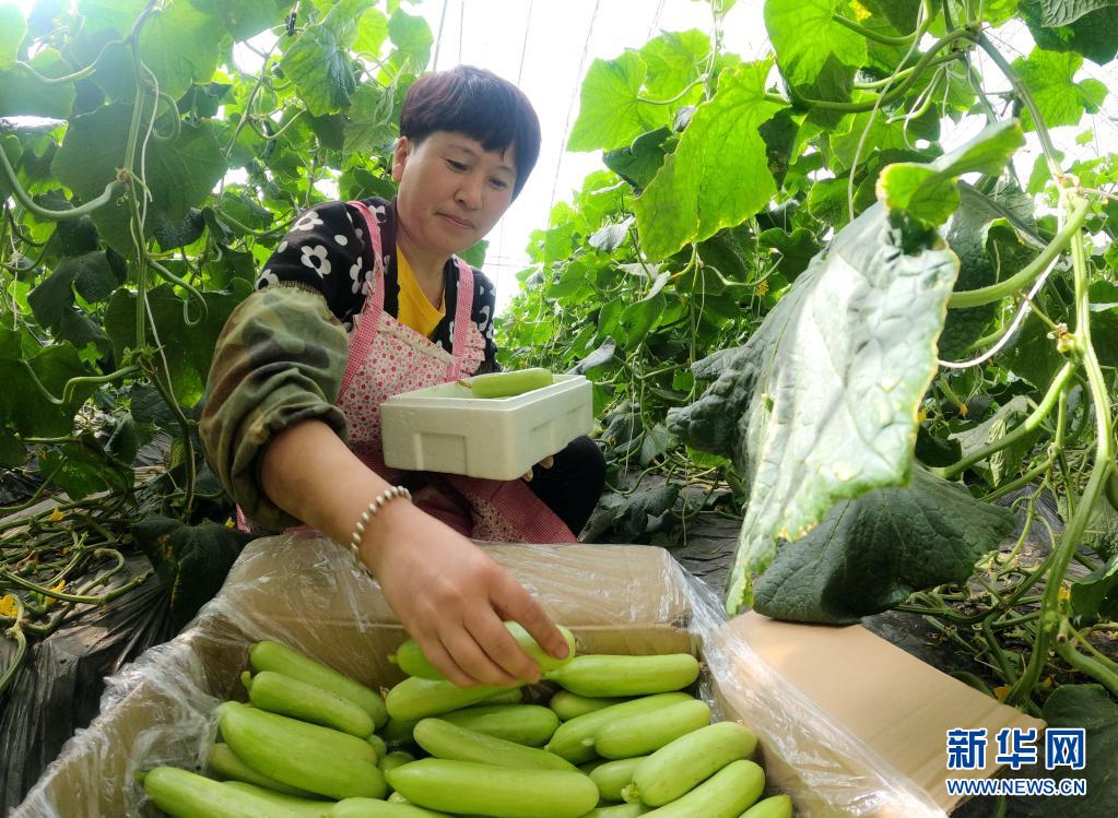 3月29日,秦皇岛市抚宁区食正源蔬菜种植专业合作社社员将刚采摘的黄瓜装箱。