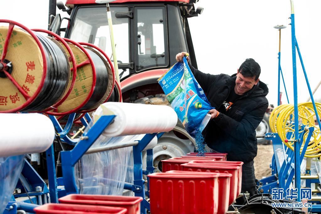 在新疆喀什地区莎车县,阿卜杜萨力·阿伍提往播种机里倒棉籽(3月26日摄)。