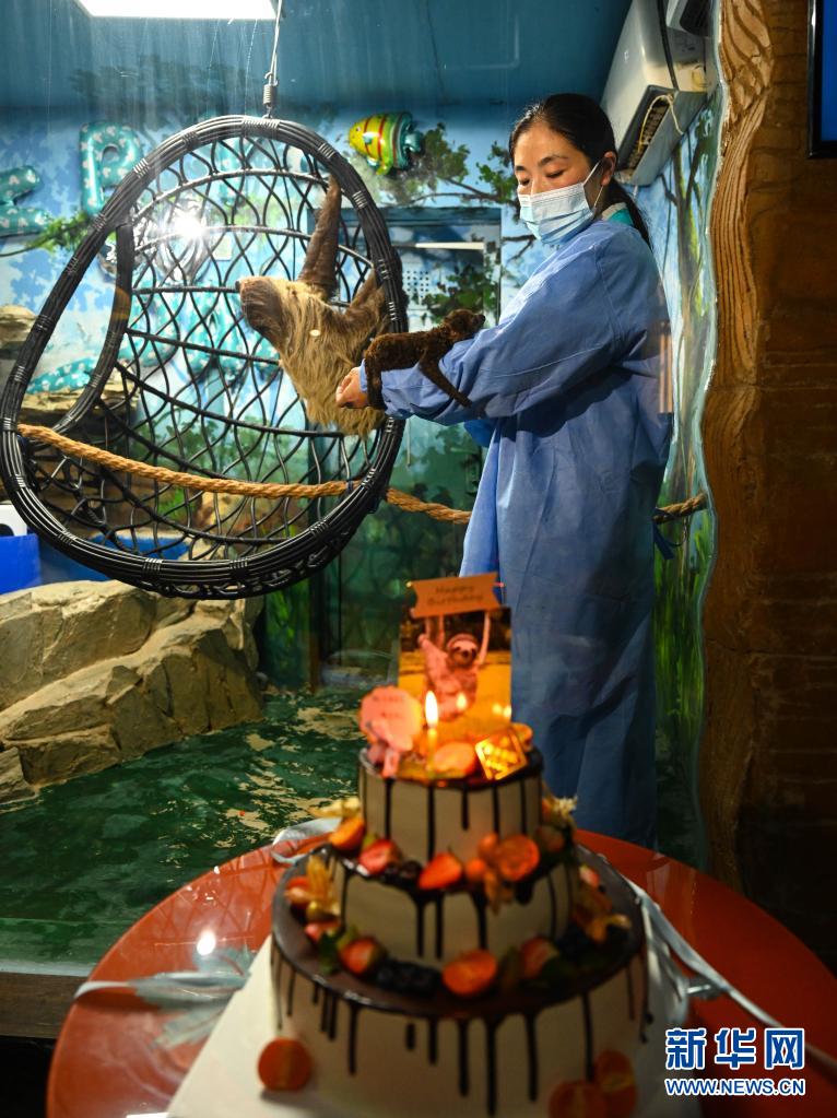 3月30日,在合肥海洋世界,饲养员在照顾树懒宝宝。