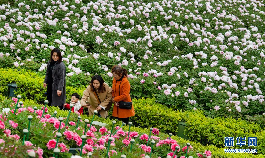 3月30日,游人在洋县朱鹮梨园景区的牡丹园赏花。