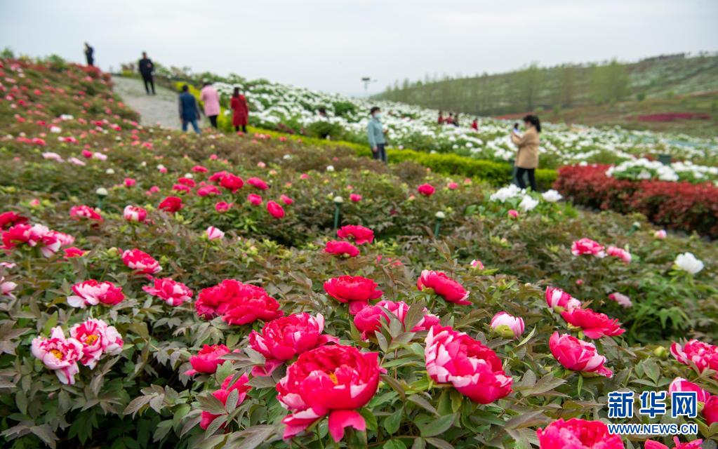近日,陕西省汉中市洋县朱鹮梨园景区的万亩牡丹园里,200多个品种的牡丹竞相开放,形成“龙凤呈祥 花开富贵”的吉祥图案,令游客流连忘返。