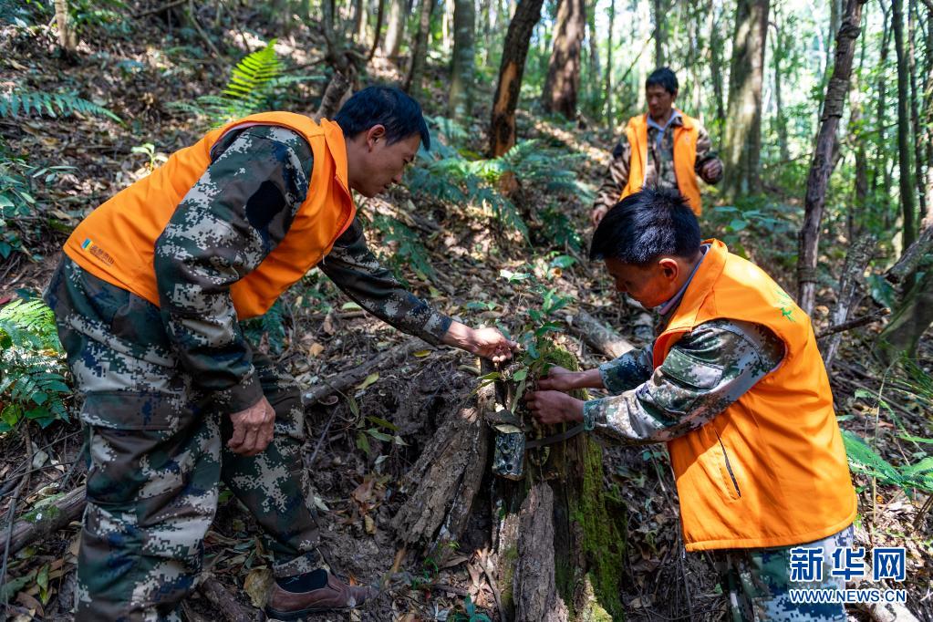 杨有山(右)和护林员同事在野外布设红外相机(3月15日摄)。新华社记者 陈欣波 摄