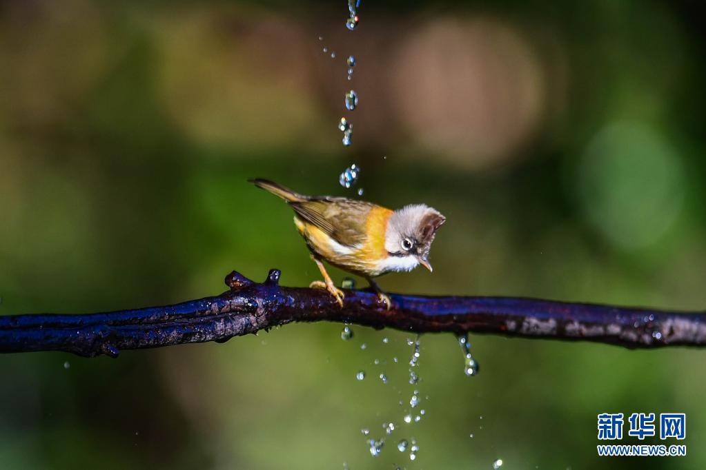 在保山市隆阳区百花岭村,一只小鸟在侯体国的“鸟塘”停歇(2020年12月4日摄)。新华社记者 胡超 摄