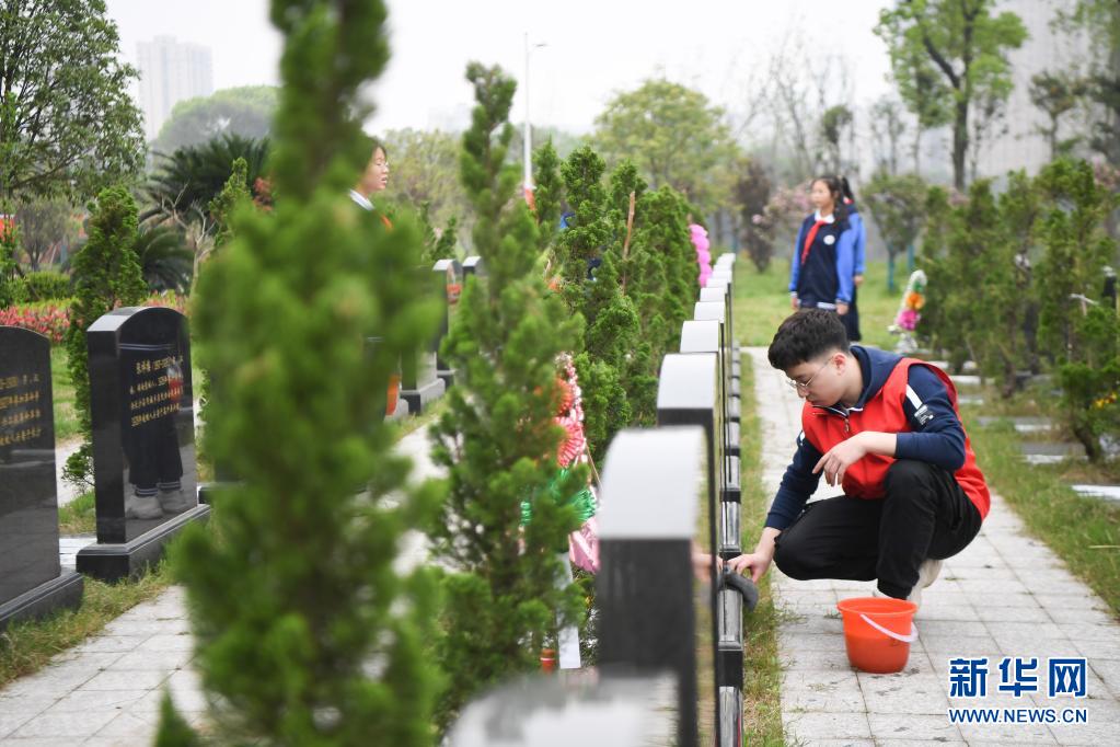 3月30日,志愿者在湖南革命陵园擦拭墓碑。