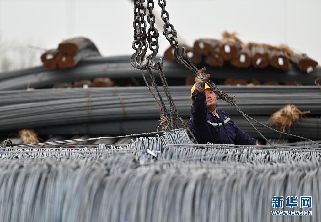 3月30日,铁路工人在中国铁路西安局集团有限公司新筑铁路物流中心卸运钢材。新华社记者 李一博 摄