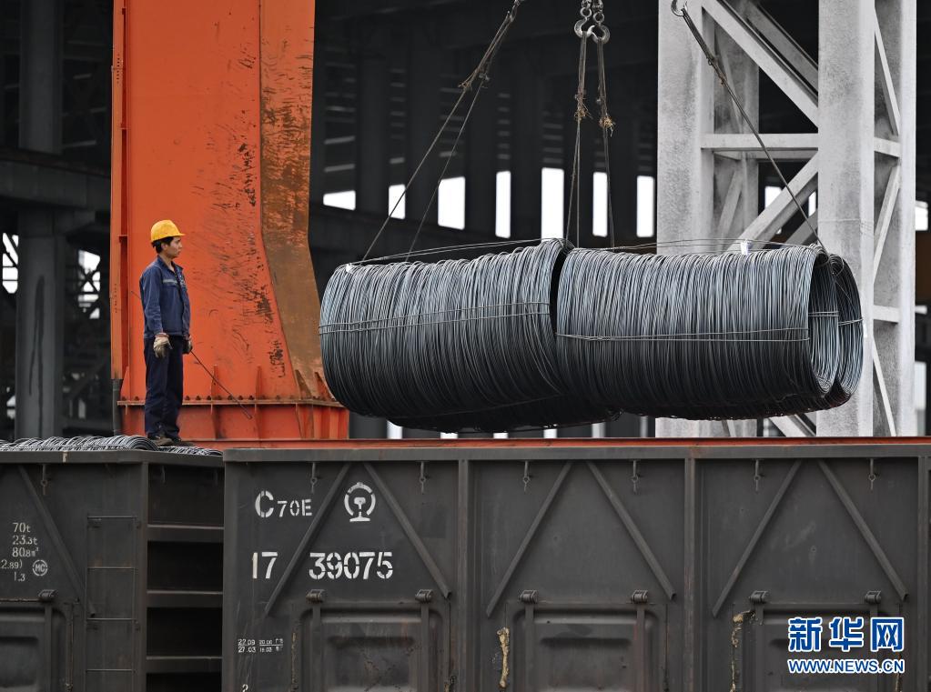 3月30日,铁路工人在中国铁路西安局集团有限公司新筑铁路物流中心卸运钢材。新华社记者 李一博 摄
