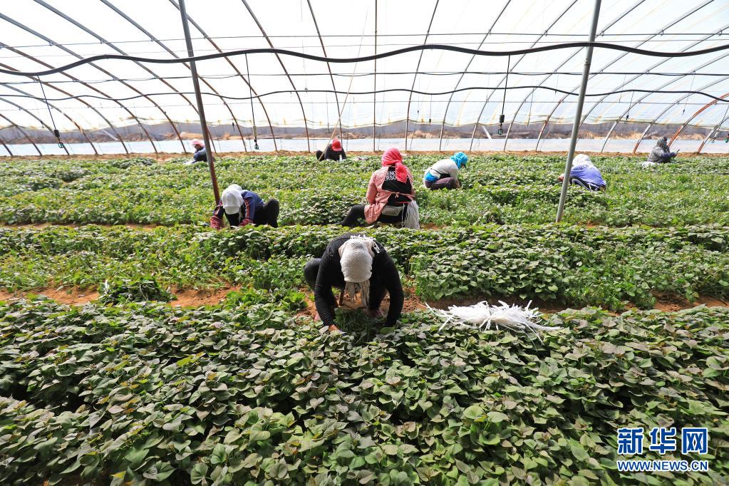 3月30日,唐山市滦南县东黄坨镇薯泽种植专业合作社农民在温室里采集红薯秧苗。