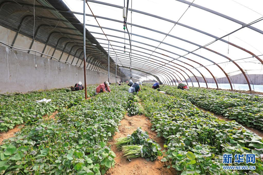 3月30日,唐山市滦南县东黄坨镇薯泽种植专业合作社农民在温室里采集红薯秧苗。