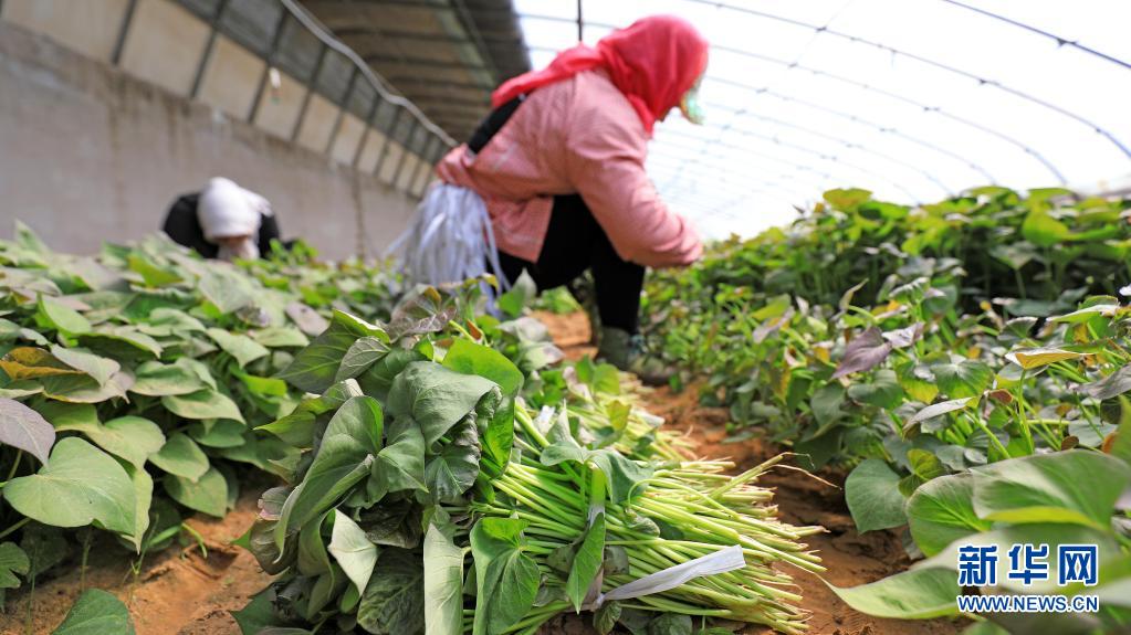 3月30日,唐山市滦南县东黄坨镇薯泽种植专业合作社农民在温室里采集红薯秧苗。