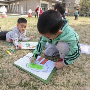 3月30日,小朋友在中国儿童中心内用彩笔和树枝树叶等材料“画春天”。