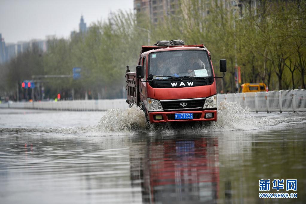 3月31日,一辆工程车涉水驶过银川市兴庆区上海路(北塔湖附近路段)。