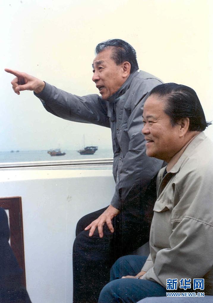1980年袁庚(左)在海上考察蛇口(资料照片)。新华社发