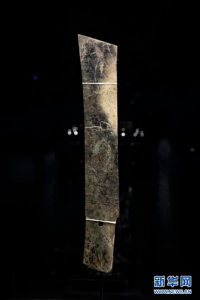 这是在位于四川省广汉市的三星堆博物馆拍摄的1986年出土于三星堆2号“祭祀坑”的祭山图玉璋(3月17日摄)。该玉璋两面阴刻相同的图案,图案分上下两组,正反相对呈对称布局,每组纹饰包含山陵、牙璋、云雷纹和两排做祭拜状的人像。新华社记者 沈伯韩 摄