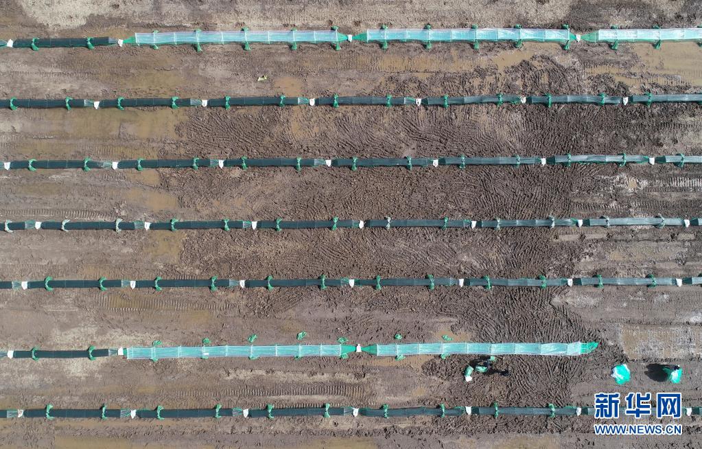 3月31日,在乐亭县姜各庄镇中海滨村一处海参养殖基地,工人在改建的养殖池内铺设人工礁(无人机照片)。