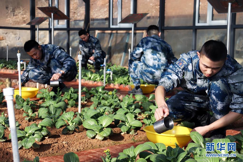 北部战区空军某旅“红色前哨雷达站”官兵在新建的蔬菜大棚里浇菜(2月4日摄)。新华社发(梅嘉齐 摄)
