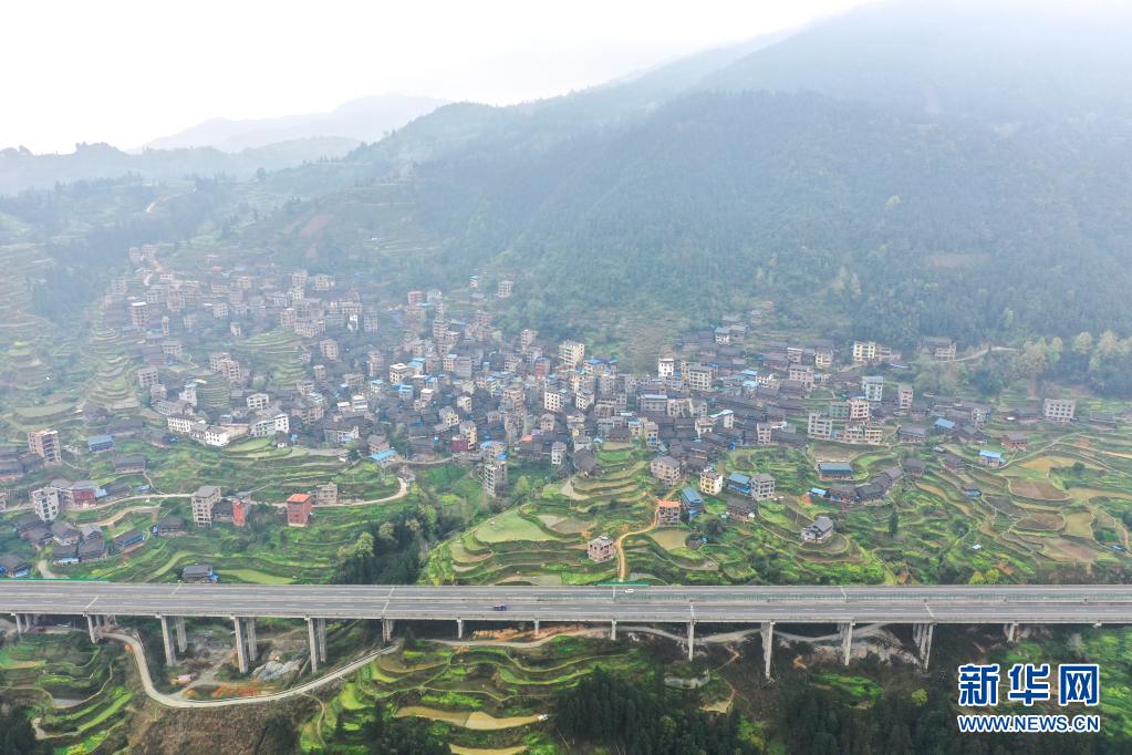 这是高速公路经过广西三江侗族自治县独峒镇唐朝村(3月16日摄,无人机照片)。