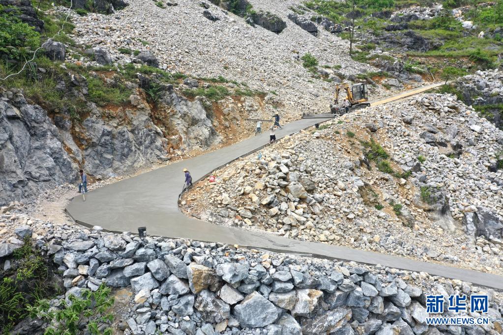 广西大化瑶族自治县七百弄乡弄合村弄根屯群众在修建进屯路(2020年5月13日摄,无人机照片)。