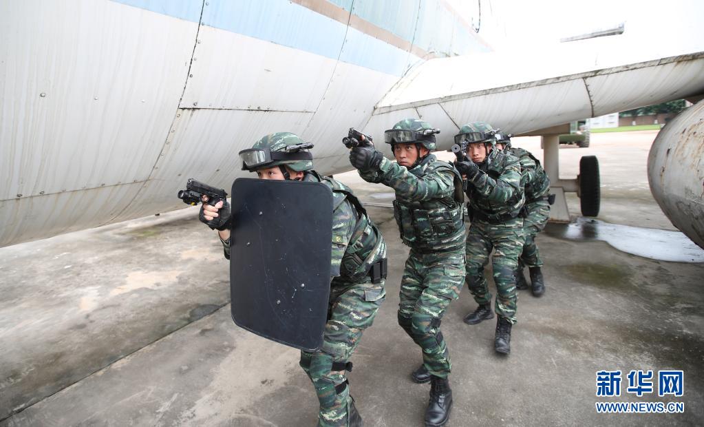 武警广东总队机动支队某中队中队长彭星(左二)与特战队员在反劫机战术训练中隐蔽接近目标(2019年5月23日摄)。