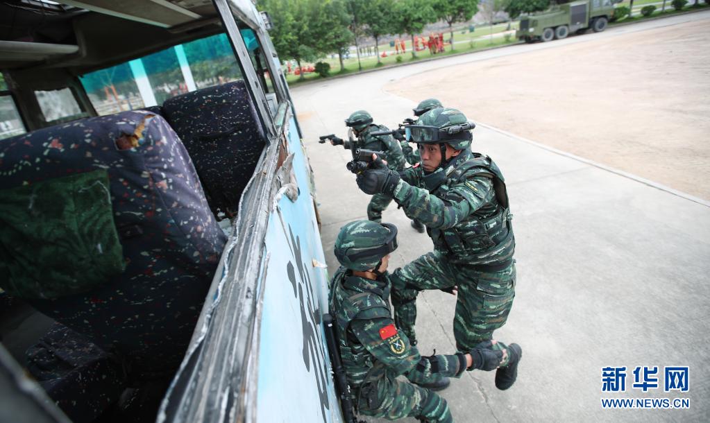 武警广东总队机动支队某中队中队长彭星与特战队员进行公交车反劫持训练(2019年5月23日摄)。