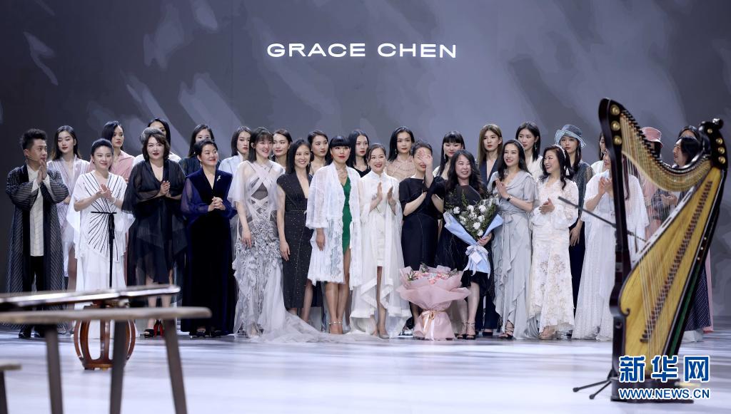 3月31日,在北京举行的2021秋冬中国国际时装周“GRACE CHEN 高级时装·Grace Chen”发布会上,设计师陈野槐(前、挥手者)和职业模特及嘉宾模特谢幕。新华社记者 陈建力 摄