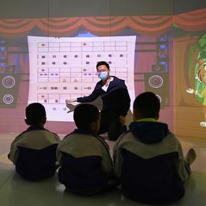 在天津市北辰区特教学校的“音乐魔方”教室内,周鹏程给患有自闭症的学生上课(3月29日摄)。