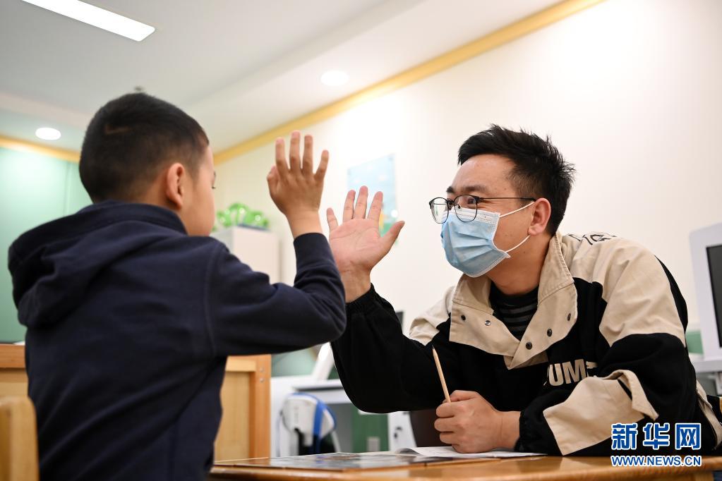 在天津市北辰区特需中心,周鹏程给患有自闭症的学生进行康复训练(3月25日摄)。新华社记者 李然 摄