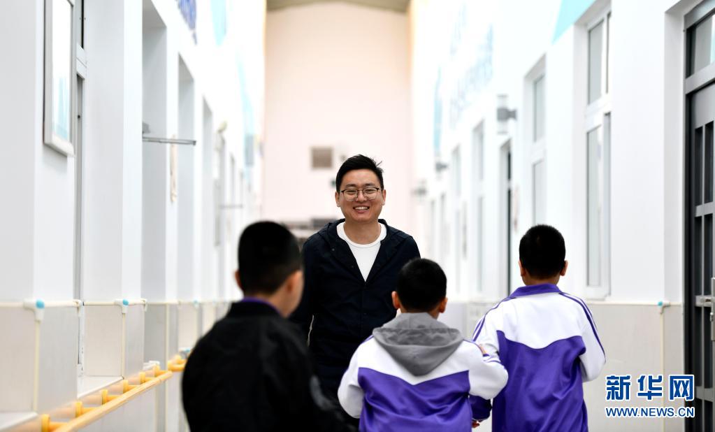 在天津市北辰区特教学校,周鹏程和患有自闭症的学生在一起(3月29日摄)。新华社记者 赵子硕 摄