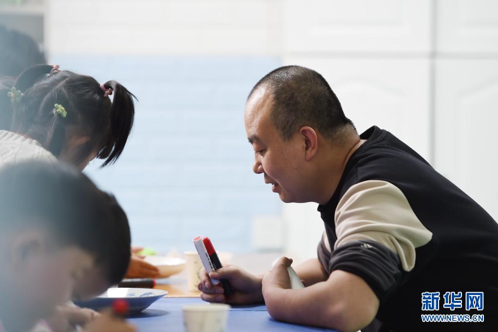 在兰州欣雨星儿童心理发展中心,丁强(右)引导孩子进行科学实验(3月30日摄)。