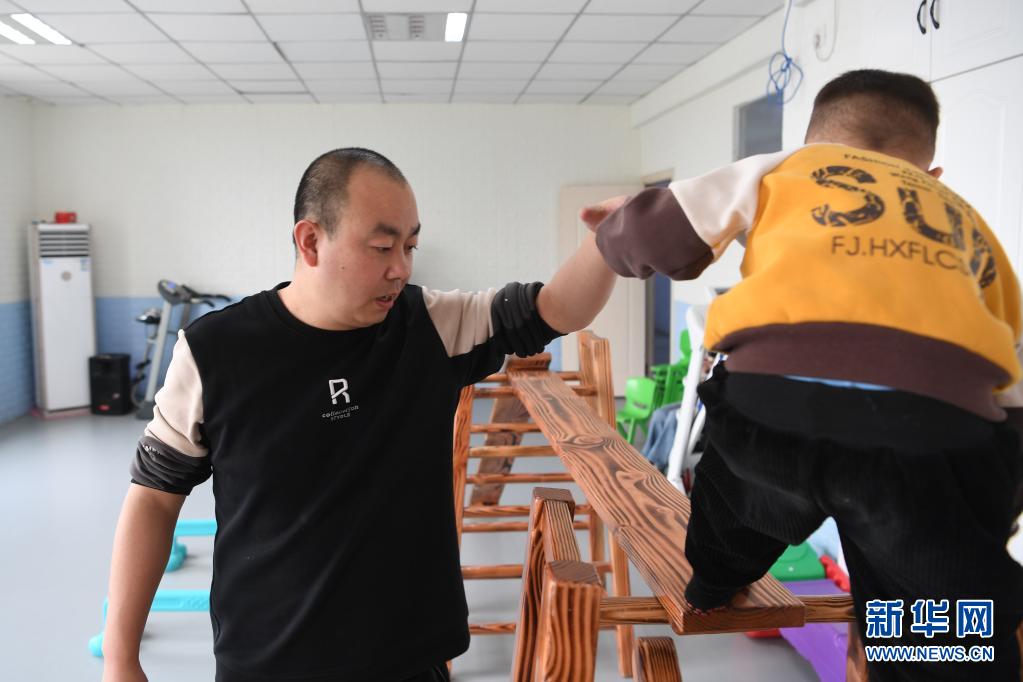 在兰州欣雨星儿童心理发展中心,丁强(左)引导孩子进行体能训练(3月30日摄)。