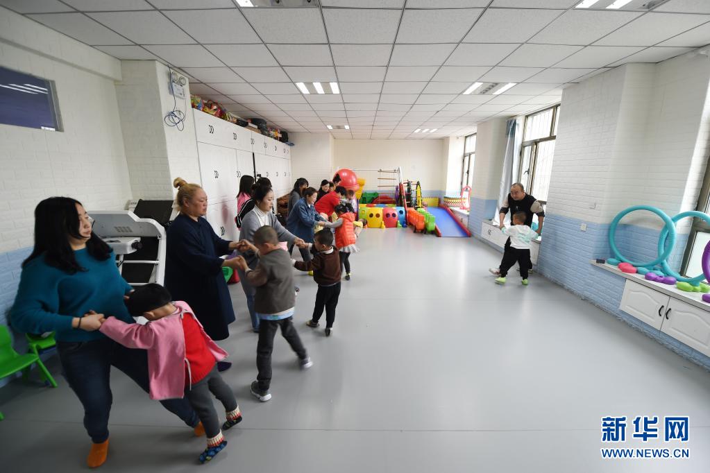 在兰州欣雨星儿童心理发展中心,丁强(右一)引导孩子和家长开展体育运动(3月30日摄)。