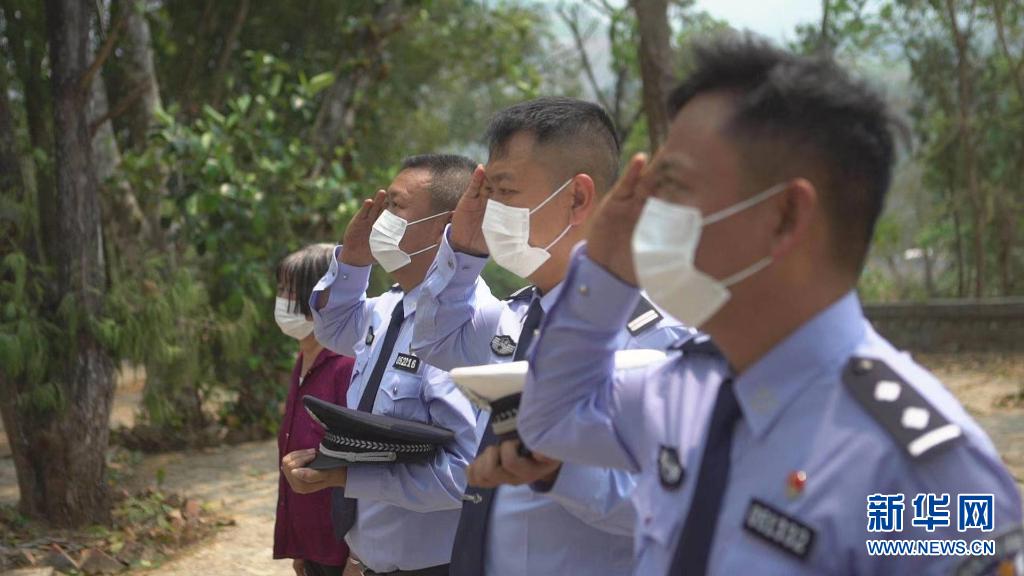 2020年清明,张子权(右一)三兄弟在父亲墓前敬礼(视频截图)。新华社发