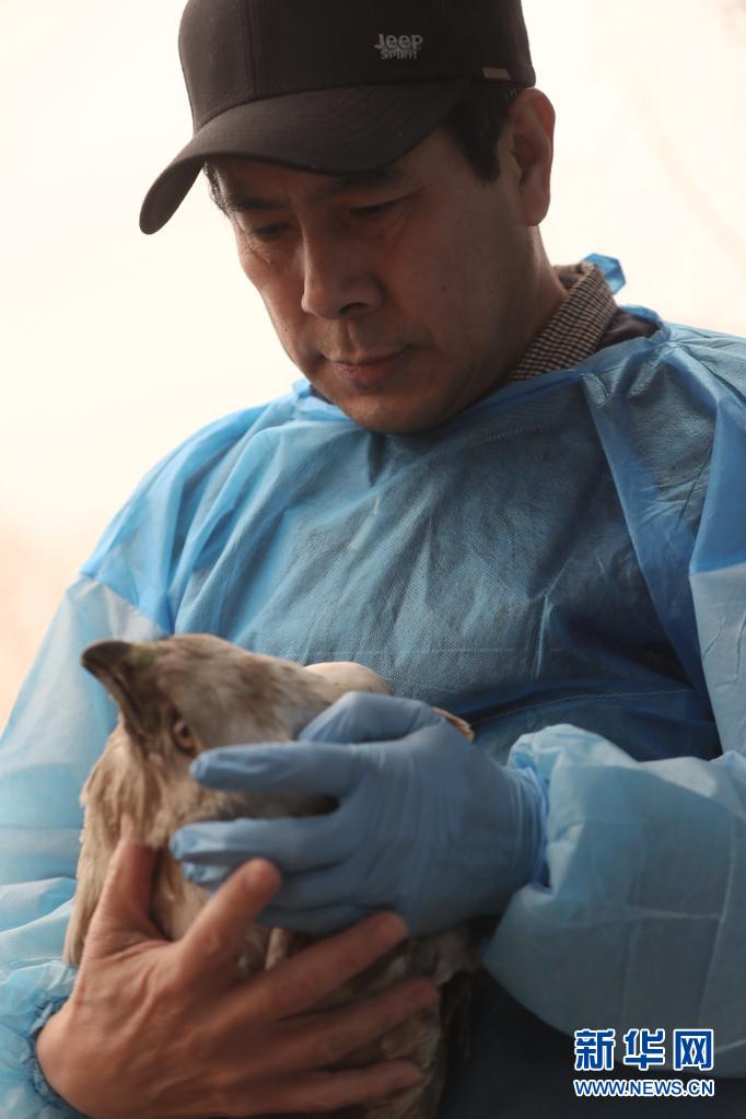 3月28日,沈阳猛禽救助中心的王唯彦在查看一只受伤猛禽的伤势。
