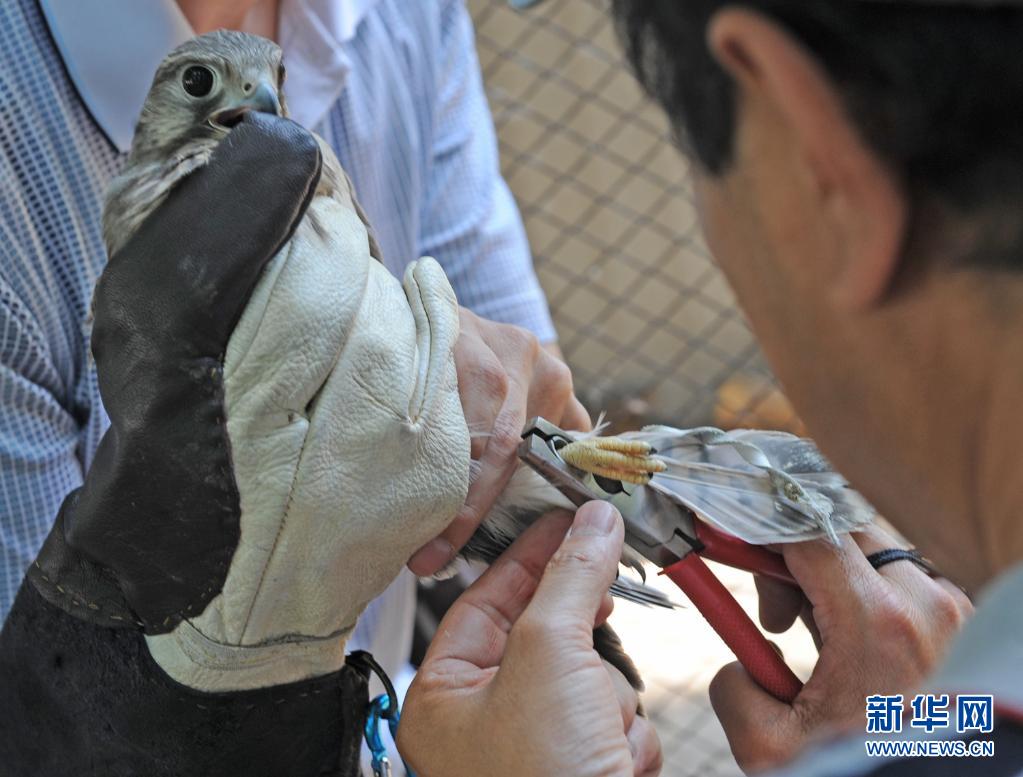 沈阳猛禽救助中心的王唯彦为准备放飞的红隼带上环志(2013年6月14日摄)。