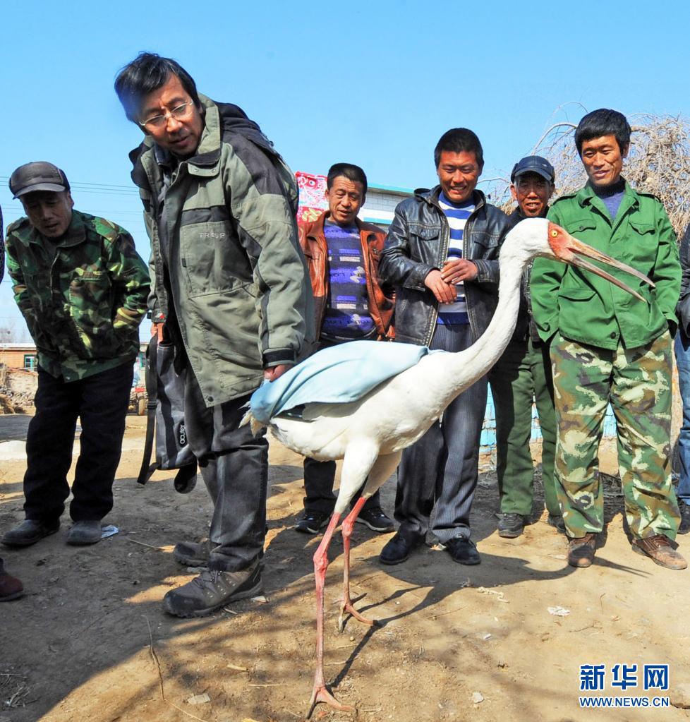 在沈阳市康平县卧龙湖湿地,沈阳猛禽救助中心志愿者周海翔(左二)和当地农民一起将救治康复的白鹤放回自然(2012年4月1日摄)。