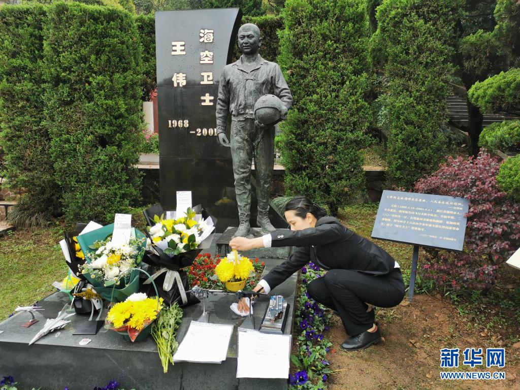 清明节前夕,工作人员打扫擦拭王伟烈士衣冠冢(3月31日摄)。新华社记者 黎云 摄