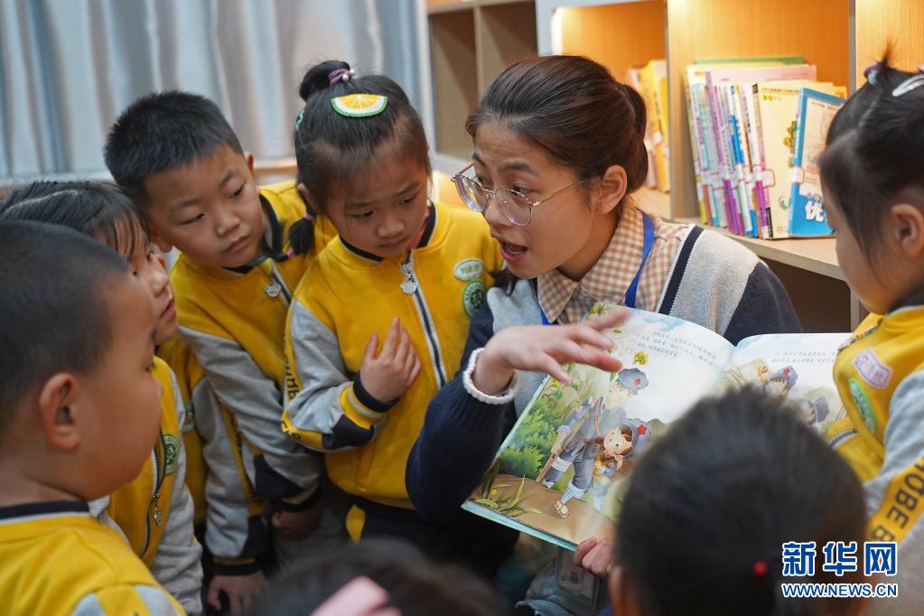 4月1日,幼儿园老师给孩子们讲述绘本上的红色故事。