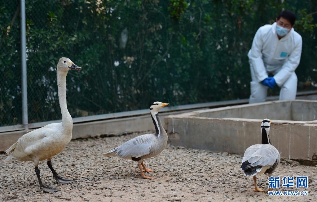 4月1日,沧州市野生动物救护中心工作人员在观察获救的天鹅和斑头雁。