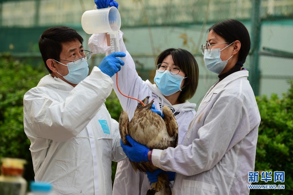 4月1日,沧州市野生动物救护中心工作人员对一只患病的大鵟进行药物治疗。
