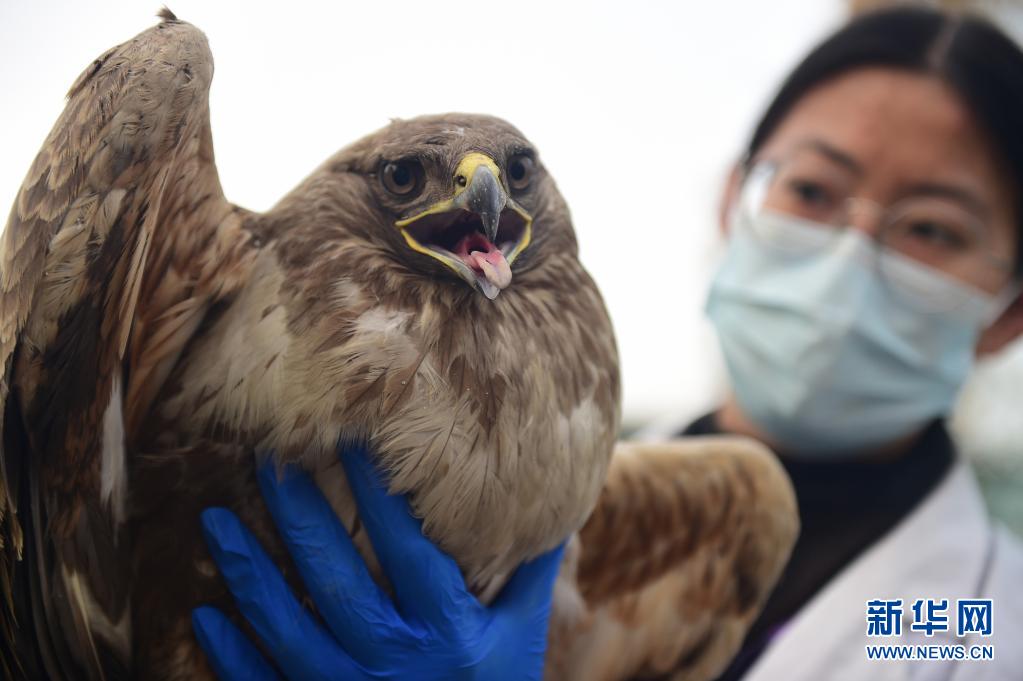 4月1日,沧州市野生动物救护中心工作人员在展示一只获救的大鵟。