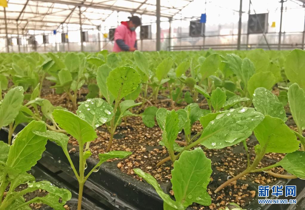 4月1日,工人在张家口市万全区一家农业公司的智能育苗棚管理菜苗。
