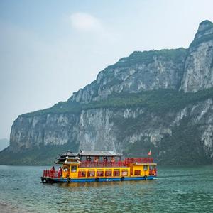 4月1日,游船行驶在黔西县新仁苗族乡化屋村旁的乌江源百里画廊景区(无人机照片)。