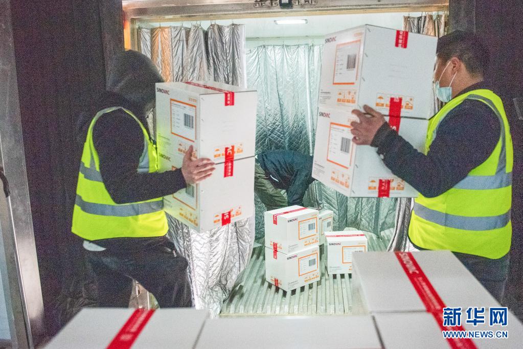 4月1日,北京科兴中维生物技术有限公司工作人员将新冠疫苗克尔来福搬上冷链货车。这批克尔来福将运往海南,支持当地新冠疫苗接种工作。