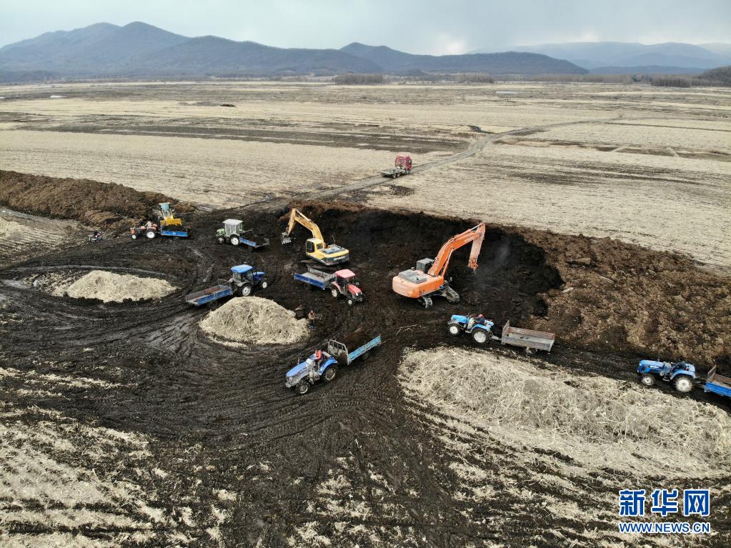 3月29日,在黑龙江省五常市沙河子镇福太村,工作人员在回填被盗挖的黑土(无人机照片)。新华社记者 马知遥 摄