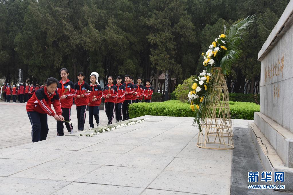 4月2日,河北省河间市第二中学学生在冀中革命烈士纪念碑前献花。