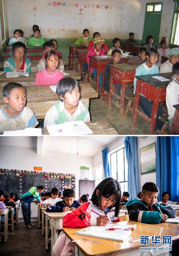 这张拼版照片的上图:2003年12月6日,云南省澜沧拉祜族自治县富邦乡半山小学的孩子们在上课(新华社记者 李银 摄);下图:2021年3月2日,云南省澜沧拉祜族自治县富邦乡半山小学已撤并到富邦乡中心完小,这是孩子们在教室里上课(新华社记者 江文耀 摄)。新华社发
