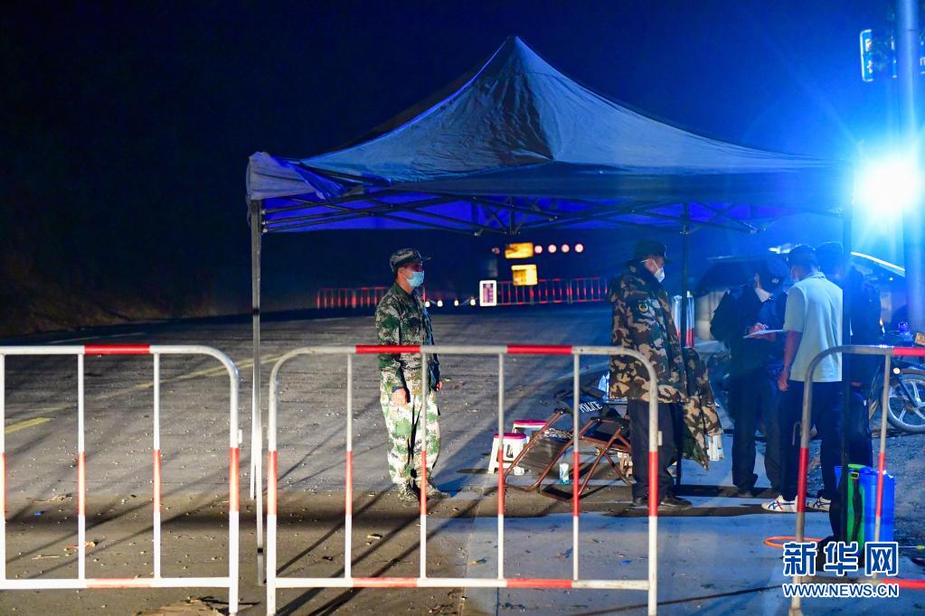 4月1日,记者从瑞丽市区前往畹町镇途中,一个疫情防控执勤点工作人员在开展检查登记工作。