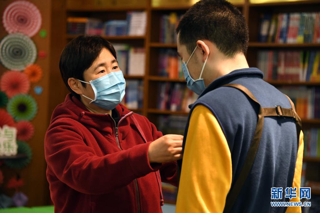 4月2日,在北京外研书店(北外店),康睿的母亲(左)为康睿整理工装。
