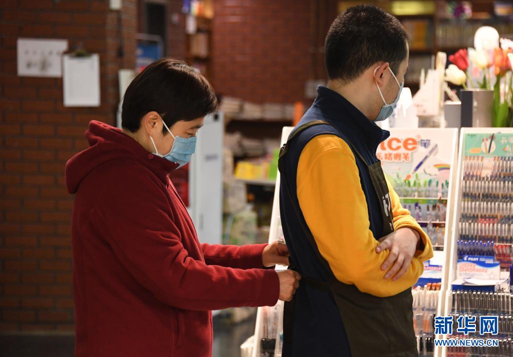 4月2日,在北京外研书店(北外店),康睿的母亲(左)为康睿整理工装。