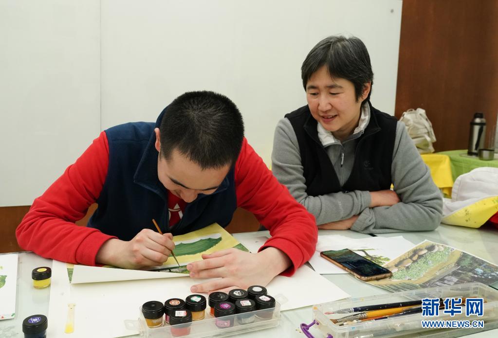 在北京外研书店(北外店),康睿(左)在画室中绘制海报(3月25日摄)。