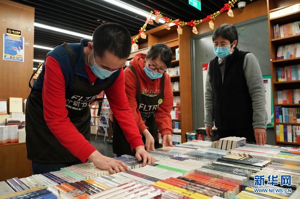 在北京外研书店(北外店),康睿(左)与工作人员(中)一起整理书籍(3月25日摄)。